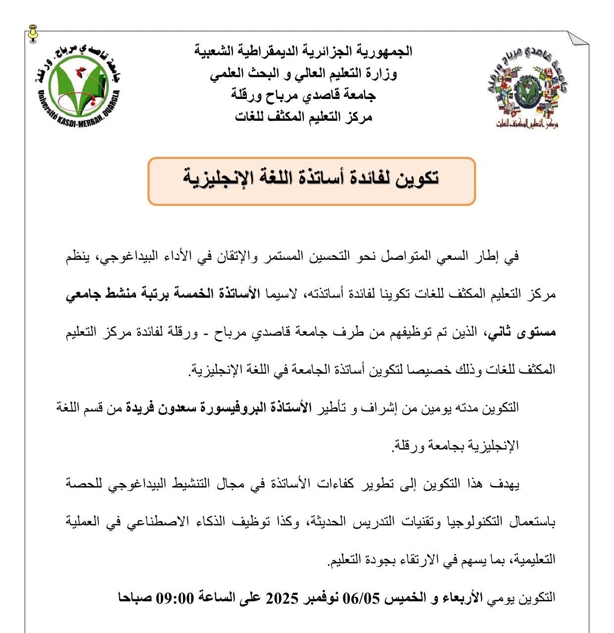 في إطار مساعي مركز التعليم المكثّف للغات CEIL بجامعة قاصدي مرباح – ورقلة لتحسين الأداء البيداغوجي والرفع من جودة التدريس، نُظّمت يومي الأربعاء والخميس 05 و06 نوفمبر 2025 جلسات تكوين لفائدة أساتذة اللغة الإنجليزية، لا سيما الأساتذة الجدد الذين تمّ توظيفهم حديثًا.